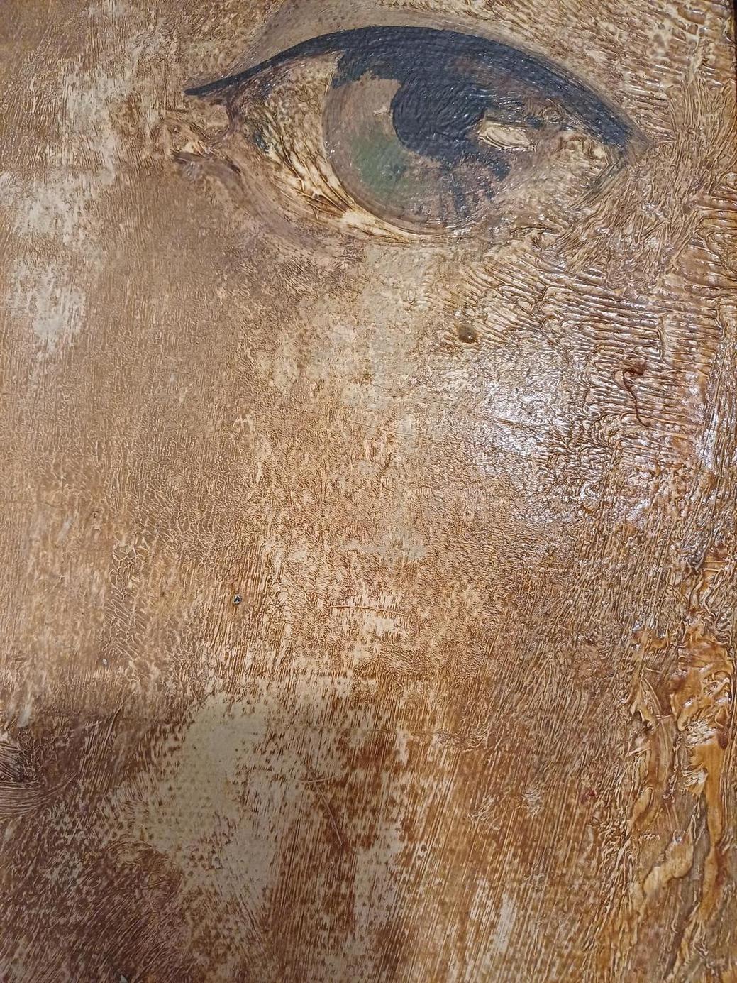 Картон, масло, по свидетельствам бывшего собственника, в 50х гг. помнят висящую на стене, рамка не родная. |