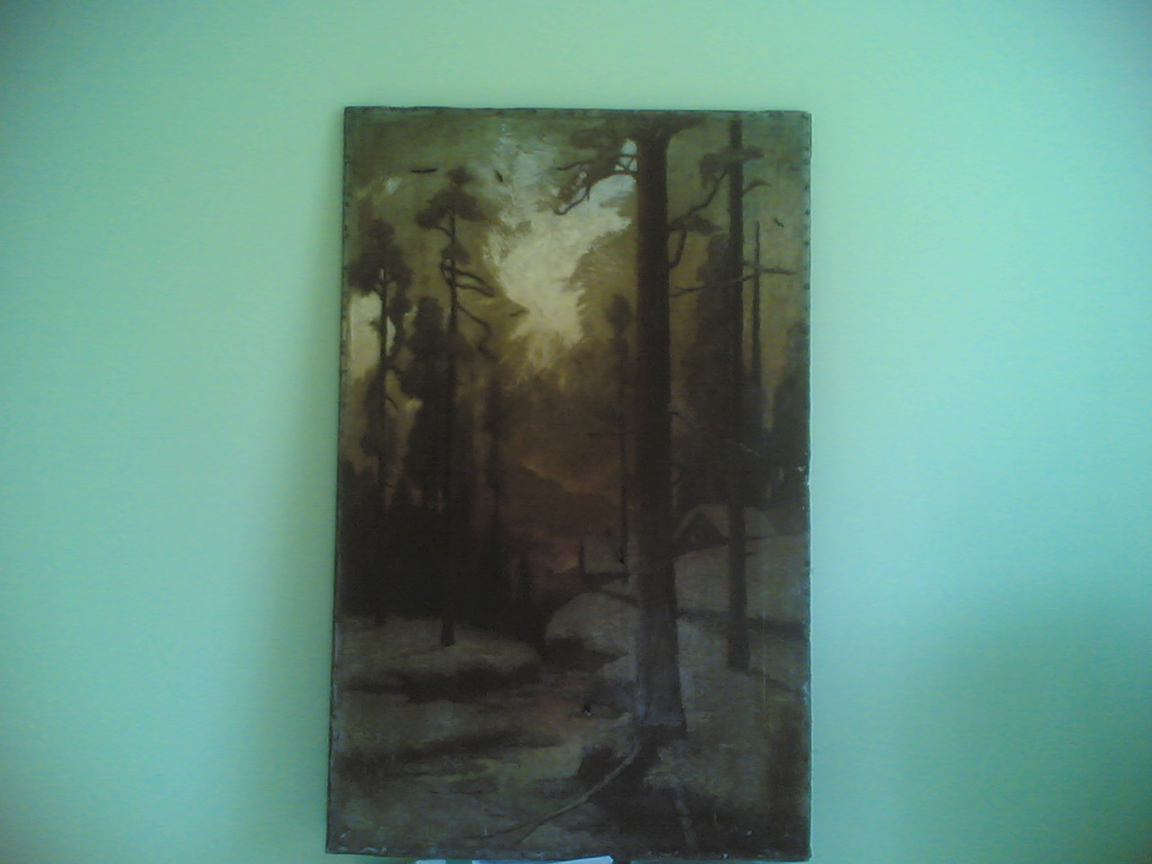 Хотелось бы узнать имя художника, если он известен. Это зимний пейзаж, в небе была полная луна в сумраке с сиянием в дымке, но стерта наждаком