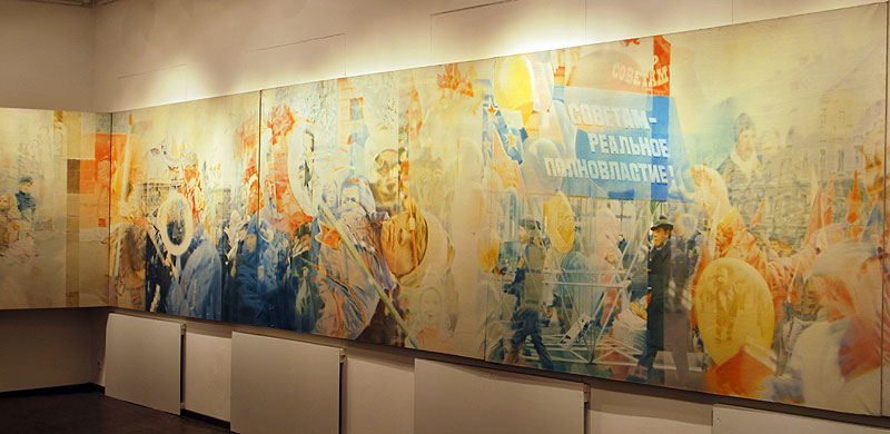 О чём речь? Последняя серия картин про бомжей - это большие изображения/фотографии напечатанные на холстах. При этом фотографии разогнаны до появления "пикселов", всё с грубыми переходами цвета и размыто. Для чего я так подробно описываю? Да потому что когда такое разогнанное изображение снова фотографируешь и потом смотришь его маленьким, вот как сейчас у вас на экране, то возвращаешь весь процес в начало и на выходе - просто фотография, что мы здесь и видим. Созданный эффекат живописи исчез. Повторяю вопрос: - это важно? Главное не техника, а мысль, скажут искушённые ценители современного искусства. Так ли? Мне не понравилась новая серия. Ни техники исполнения, ни сюжеты (смотреть на опустившихся людей не самое лучшее удовольствие) ни, самое главное, энергии. Ничего не исходит от картин. Так бы и ушёл разочарованный если бы не завернул за угол одного из коридоров. Картины 90-х - совсем другое дело. И сюжет, и техника и энергетика всё есть. Надеюсь Владимир выложит, обсудим по живому. О пока писал это уже случилось. |