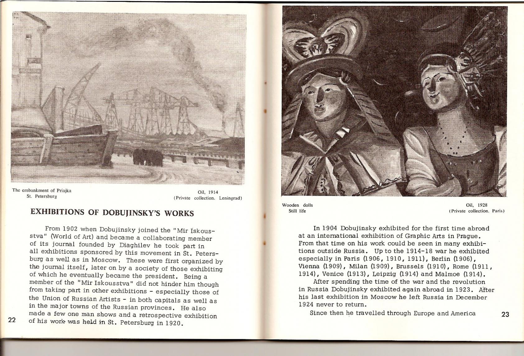1. Литва. Каталог выставки картин и рисунков в International Institute в Бостоне. 1940. 6 стр. Иллюстрации. На англ. языке. 140мм х 216мм. Со штампом семейного собрания М.Добужинского. В практически идеальном состоянии. 2. Каталог выставки эскизов театральных декораций и костюмов в Marie Sterner Gallery в Нью-Йорке. 1941. 5 стр. Иллюстрации. На англ. языке. 145мм х 230 мм. Со штампом семейного собрания М.Добужинского. Незначительные загрязнения обложек, в остальном состояние близко к идеальному. 3. Слово о Полку Игореве. Иллюстрации М.Добужинского. Издание Нового Журнала. Нью-Йорк. 1950. 92 стр. 135мм х 185мм. Со штампом семейного собрания М.Добужинского. Незначительные водяные разводы по краям задней стороны обложки и обоих форзацев, в остальном состояние близко к идеальному. http://feb-web.ru/feb/slovo/critics/isl/isl-229-.htm 4. Balys Sruoga “Giesme apie Gedimina”. Kaunas. 1938. Факсимильное воспроизведение 1952 года. Чикаго. Тираж 700 экз. На литовском языке. Обложка и иллюстрации М.Добужинского. Со штампом семейного собрания М.Добужинского. В практически идеальном состоянии. 5. Каталог мемориальной выставки в Seven Arts Center Gallery в Нью-Йорке [1959]. 16стр. Иллюстрации. На англ. языке. 108мм х 140мм. Со штампом коллекции В.Добужинского (младшего сына художника). Незначительные загрязнения обложек, в остальном состояние близко к идеальному. 6. Каталог мемориальной выставки в Victoria and Albert Museum в Лондоне. 1959. 24стр. Иллюстрации. На англ. языке. 108мм х 140мм. Незначительные загрязнения обложек, в остальном состояние близко к идеальному. 7. Каталог выставки в The Storm King Art Center в Mountainville [1967]. Состоит из двух частей – непосредственно каталог и библиографический буклет. 8стр. и 6стр. Иллюстрации. На англ. языке. 178мм х 126мм. Со штампом коллекции Всеволода Добужинского (младшего сына художника), благодаря кому выставка и состоялась. В практически идеальном состоянии. 8. Mstislav V. Dobujinsky. Био- и библиографический буклет. 1973. 63стр. Иллюстрации. На англ. языке. 110мм х 140мм. Со штампом коллекции В.Добужинского (младшего сына художника). Незначительные следы ржавчины около скрепок, в остальном состояние близко к идеальному. 9. Каталог выставки «Старая Литва» в Литовском культурном обществе в Нью-Йорке. 1973. 4стр. На литовском языке. 230мм х 153мм. Со штампом коллекции Всеволода Добужинского (младшего сына художника). В практически идеальном состоянии. 10. Каталог выставки «Литва» в Галерее Чюрлёниса в Чикаго. 1975. 2стр. На литовском языке. 154мм х 228мм. Со штампом коллекции Всеволода Добужинского (младшего сына художника). Незначительные загрязнения передней страницы, в остальном состояние близко к идеальному. 11. М.Добужинский «Воспоминания». Том 1 (единственный выпущенный). «Путь жизни». Нью-Йорк. 1976 408 стр. Мягкая обложка и художественное оформление книги Всеволода Добужинского. Иллюстрации. 152мм х 230мм. Со штампом коллекции В.Добужинского (младшего сына художника). Состояние близко к идеальному. 12. Каталог выставки. [1977] 8стр. Иллюстрации. На литовском языке. 190мм х 265мм. Со штампом коллекции В.Добужинского (младшего сына художника). Загрязнения, замятости и царапины на обложках, незначительный надрыв снизу передней обложки, в остальном состояние хорошее. 13. «Полвека в театральном искусстве. 1907-1957». Каталог выставки в New York Public Library в Нью-Йорке. 1979. 35стр. Иллюстрации. На англ. языке. 210мм х 240мм. Со штампом коллекции В.Добужинского (младшего сына художника). Незначительные загрязнения обложек, в о