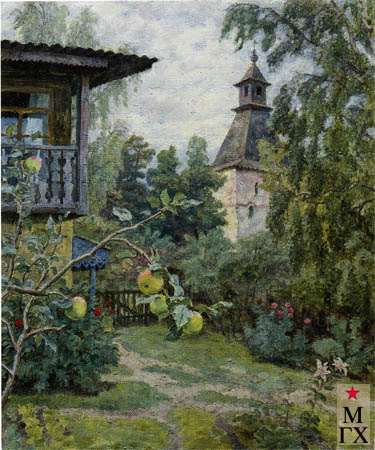 Сложность, глубина пространства присущи большинству работ Борисоглебского цикла. В картине “Вход в монастырь” - голубое небо с белоснежными фигурными июльскими облаками и куполами храмов, увиденное через теплую, как бы “пропущенную”, едва намеченную арку. Пространство здесь как будто движется по спирали в глубь холста, уводя зрителя в бесконечность.