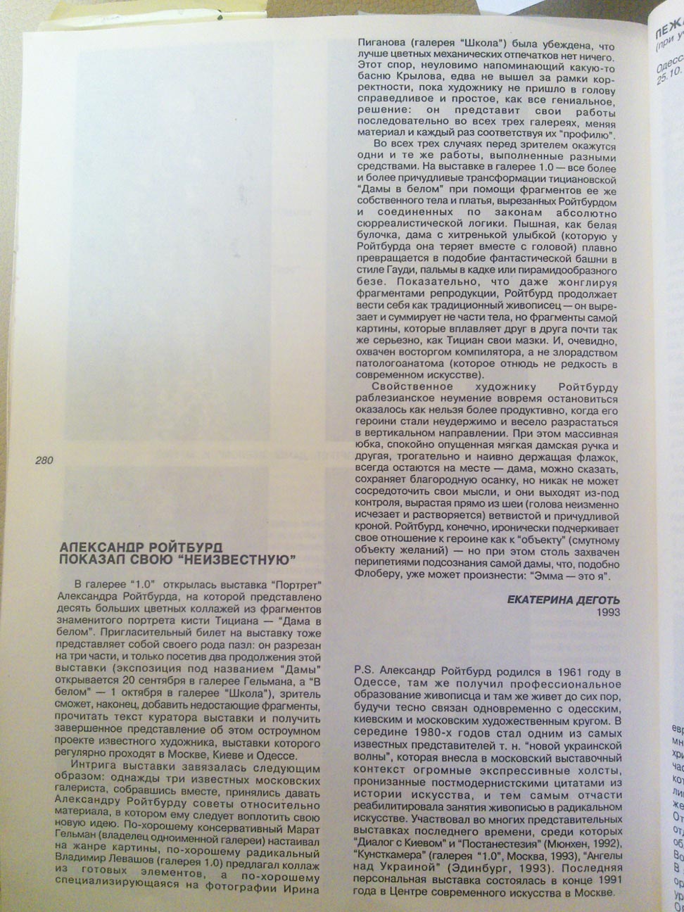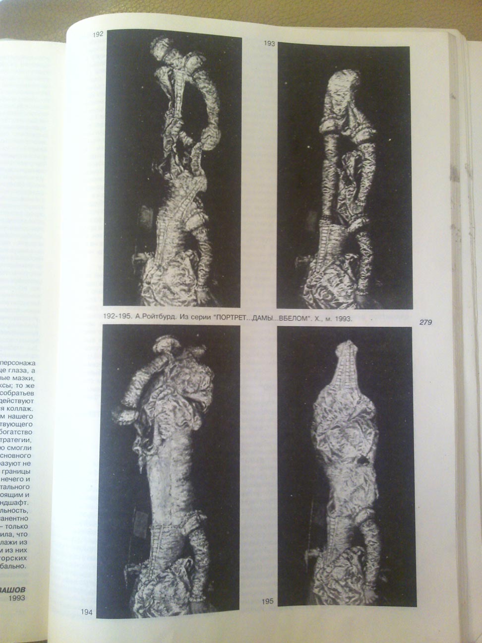 Сфотографировали друзья статью Е.Деготь 1993 г. Как раз о истории происхождения этих коллажей. В 1993 был проект под названием "Портрет...Дамы...в белом" и три выставки, первая называлась "Портрет..." Москва, галерея "1.0" вторая "...дамы..." Москва, галерея Гельмана и третья "...в белом" Москва, галерея "Школа" Представленные коллажи это два из десяти цветных коллажей которые экспонировались на первой выставке "Портрет..." Москва, галерея "1.0" у Владимира Левашова 11.09.-20.09.1993г. В галерее Гельмана экспонировались холст масло и в в галерее "Школа" как я понимаю фото. Думаю эта история не безынтересна.
