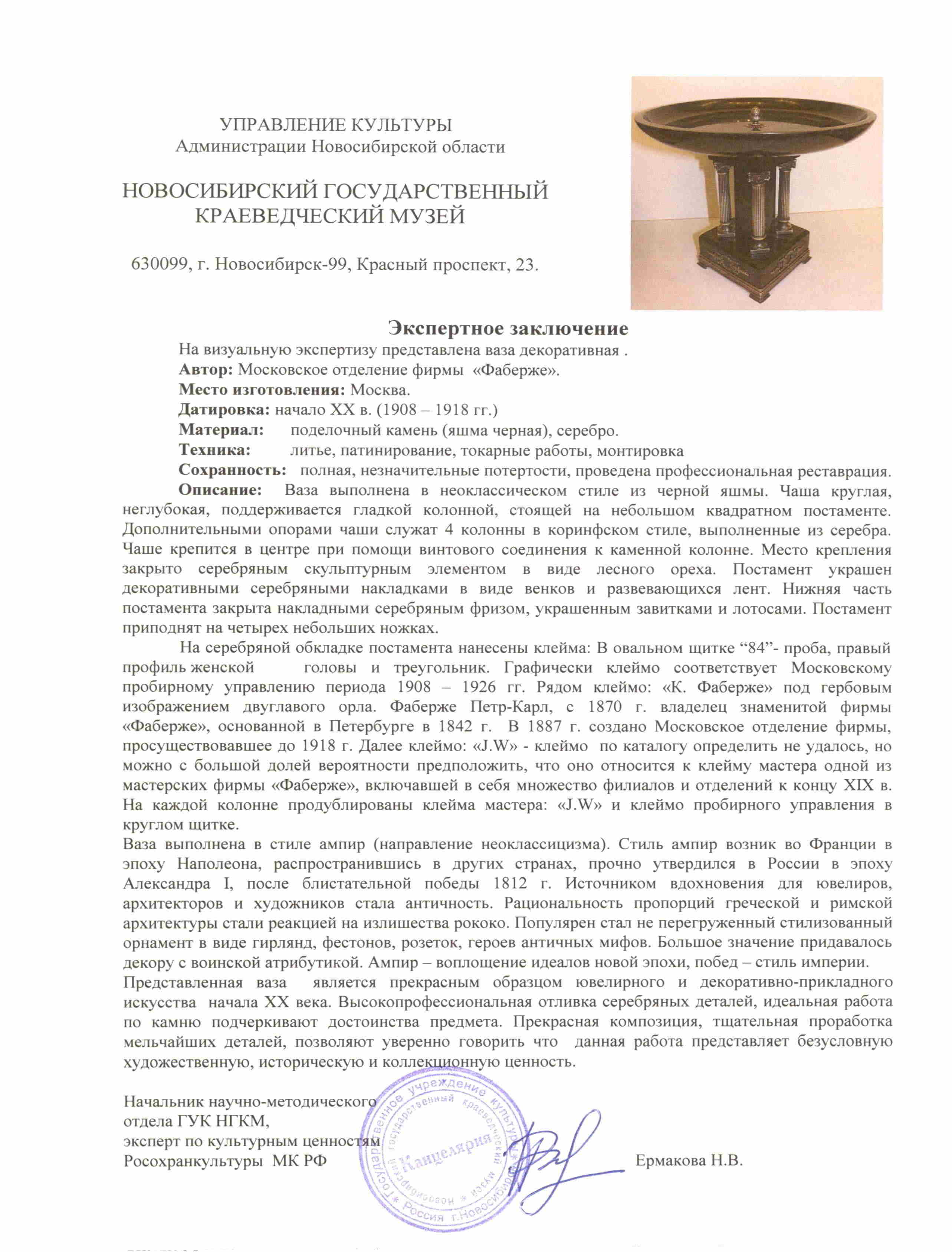 Material: jasper, silver Dimensions: Height - 23,5 cm width of the base - 12 cm diameter of the bowl - 27 cm weight - about 5 kg. Condition: close to ideal Requires assessment of authenticity and value. |