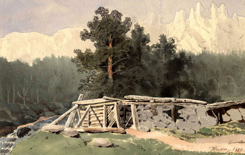«Горный пейзаж» (бумага, акварель), написанный цесаревичем Николаем Александровичем Романовым в 18 лет (подпись: "Ники. 1886. 22 июля"):