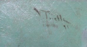 Пока дать ответ с определенностью не могу. Снимок бы получше, да и изображение картины. Хотя бы ее сюжет подскажите. И еще: что-то просматривается перед подписью. Не стоит ли там инициал "E" или "V"? А число по фото вроде бы похоже на 93.