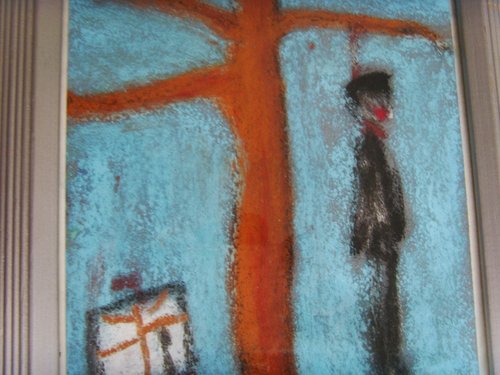 Помогите , пожалуйста, определить автора этой весёлой картинки. Повесился художник от того, что рисовать не умел, наверное? Пастель, бумага, размер 17 х 12 см.
