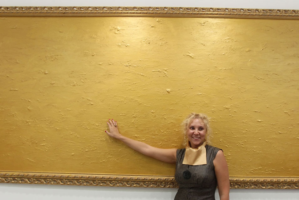 Срочно ищем фотографа Сергея Ильницкого и дальше вы догадались...![]() Фотографии перезагрузила, надеюсь не возникнет проблем с копирайтом. Русская художница Елена Золотая позирует рядом с картиной во время презентации в Москве, 5 октября 2010. Картина Золотая было создано с помощью краски из 14-каратного золота, 140 х 300 см. Это самая большая картина из золота в мире. (фото Сергей Ильницкий) PS посмотрела в интернете, но информации о ней нет