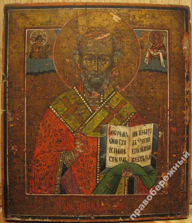 Что касается иконы святителя Николая, то это икона середины 19 века. Письмо весьма безыскуссное, Новозыбков или Стародубье. К сожалению, видны вмешательста современного "самоделкина", икона очень неумело поновлена. Молоток покажет, что 5000 руб - почти максимум Думаю, что если кто и заплатит 5-6 тыс.руб, то только человек, уверенный, что эти поновления можно исправить. |