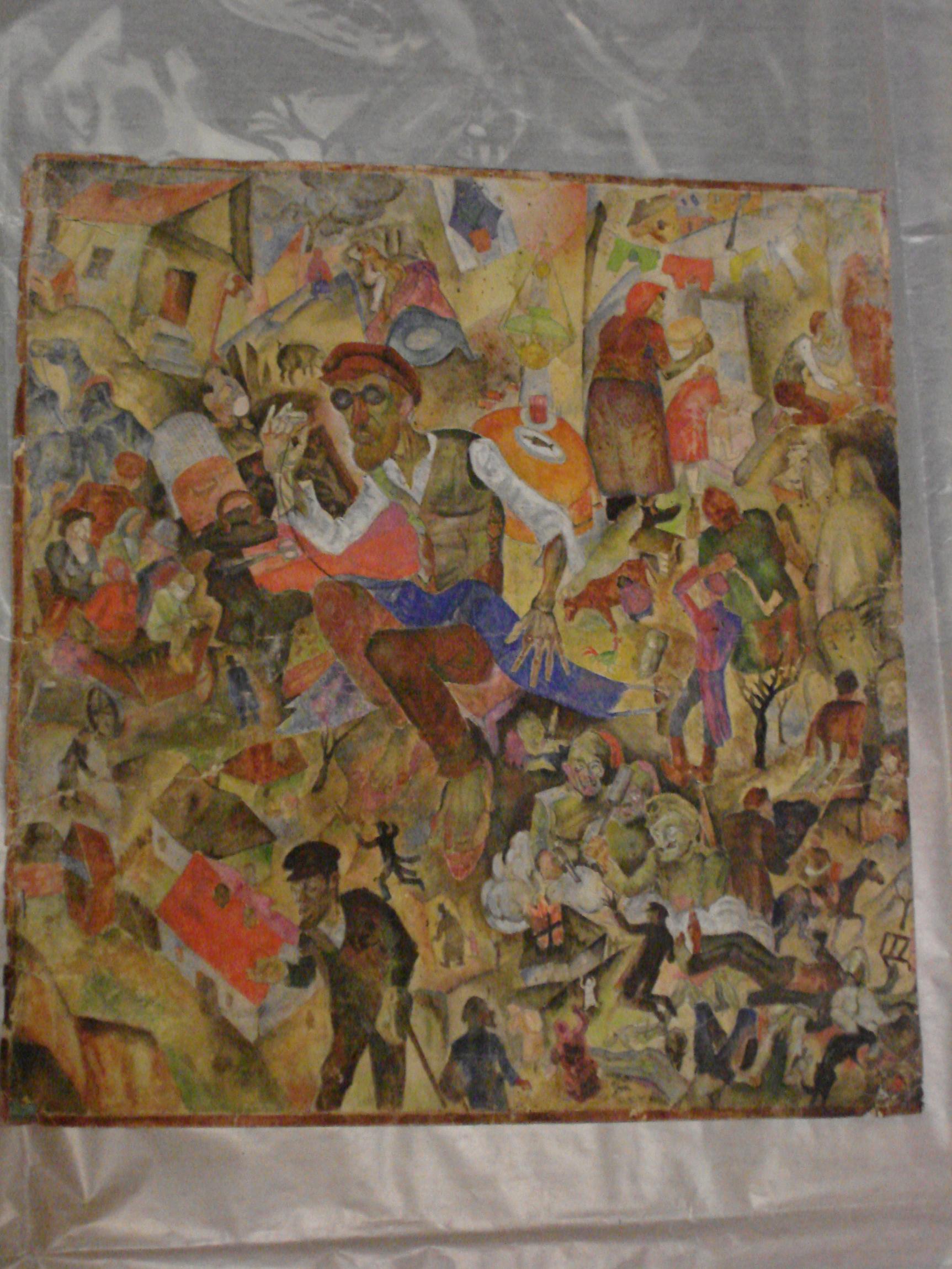 ![]() по существу - сквозь смутный туман вижу мотивы из работ И.М. Рабиновича. Но картинку ему бы не атрибутировала. Слишком литературно. Смесь шагаловских и рабинов. мотивов. |