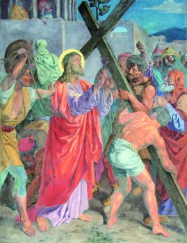 You - one of many copies of paintings of Austrian artist Josef von Fyuriha (Joseph von Führich, 1800 - 1876) "Jesus takes the cross on his shoulders," a series of "Way of the Cross." The original, written in 1844 (size 240 x 185 cm), along with other paintings of the series is in the church of St. John of Nepomuk in Vienna. The series was very popular among Catholics and was repeatedly copied in various techniques and sizes for new Catholic churches around the world, as well as prints and reproductions for the believers.