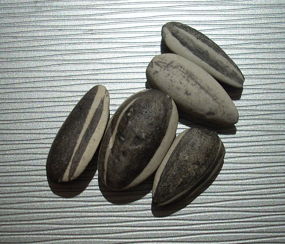Вот держу в руках эти семечки. Лена Каварга вчера подарила, они там были. Выставку, как оказалось, прикрыли. Под предлогом безопасности посетителей - вроде бы в воздухе высока концентрация керамической пыли. Или, возможно, краски. Никакой это не китайский фарфор. Это крепкая керамика, семечки похожи на гальку. Основа серая. А "полосатиков" из них сделали черной краской. Она, кстати, легко стирается. Я нес семечки в кармане с мелочью и некотороые экземпляры стерлись до полностью серого цвета.