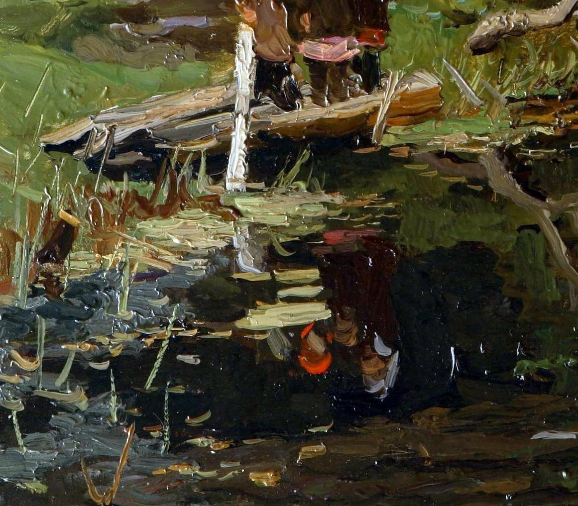 Как это выглядит и как это делается я вызнал, а на сколько это технически сложно воспроизвести... не знаю. Писать маслом многослойно это одно дело, а вот писать одним мазком многоцветно... другое. Выспрашивал у Дедули .... оказывается дело умения и техники. Выкладываю два фрагмента работ, которые в моих глазах и показывают чудо-мазки и чудесные сплавы красок. На первом фрагменте хорошо видна типичная техника прорисовки деревянного сруба. Второй фрагмент, это прорисовка луча света на деревянный пол, в тёмном помещении, где на полу разлита мыльная вода. Посмотрев на этот "кишмиш", заметив при этом, что по цвету, тонам и общему колориту всё в точку, получаешь ответ на вопрос, почему Стожарова подделать практически невозможно. |