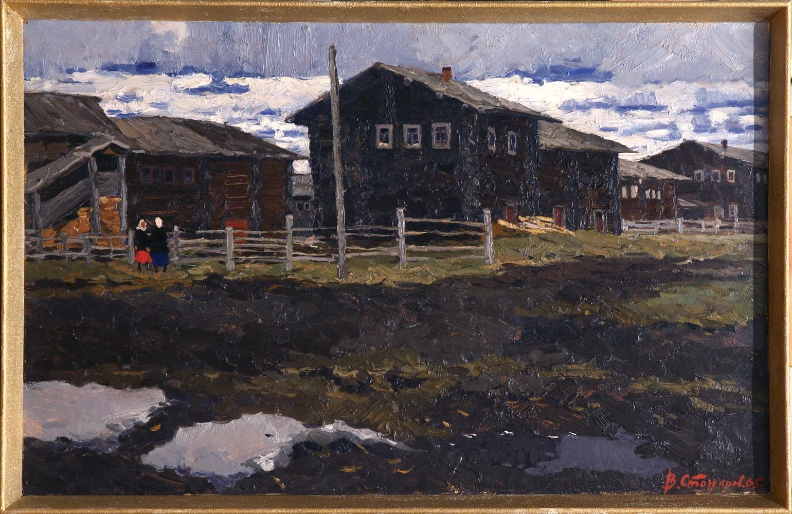 Написано более в стиле Туржанского, чем Стожарова. Написано торопливо, с натуры. Отсюда некоторые несогласовки в этюде: например,оглобли самой левой лошади ни к чему не ведут; между нею и следующей какое-то странное непроработанное пятно. Ноги "главной героини" написаны вообще как палки, никакого приличного контура. При этом странное внимание к ненужной избушке. Художник явно ставил определенную задачу (взять солнце на фигуре лошадки, наметить цветовые и тональные соотношения лошадки, телеги, сена, снега), но вряд ли можно сказать, что он с ней справился так, как бы справился Стожаров. Не исключено, что у художника было мало времени, и поэтому этюд не подписан в силу его очевидной незавершенности даже по этюдным меркам. Но кто, кроме Стожарова, мог тогда это написать, я ума не приложу. |