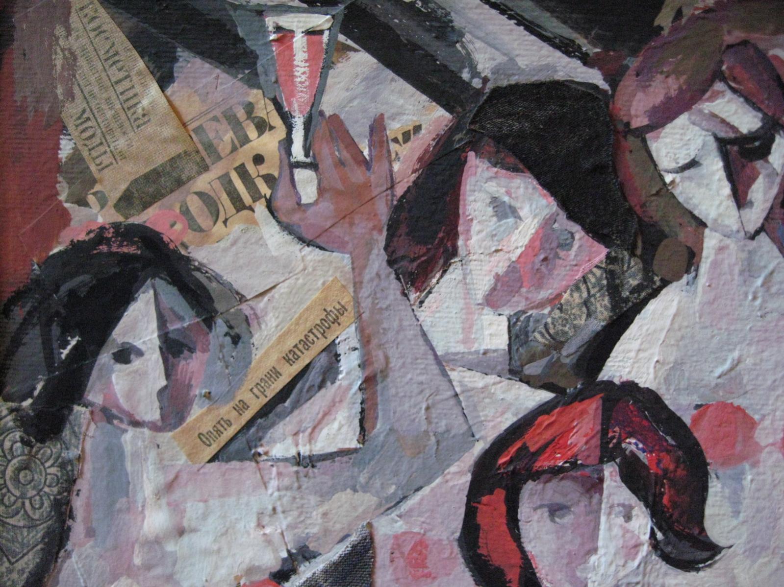 Смешанная техника: гуашь (или другая краска, но не акварель), бумага, картон, оргалит, вырезки из газеты, куски ткани, паспарту (пожелтевшее). Размеры без паспарту: 52х39 см. С паспарту: 71х52 см. Картина подклеена по краям на значительно поздний оргалит. Поэтому оборотную сторону не смог сфотографировать. Судя по тому, что родственник вращался в Советских "богемных" кругах, может быть кто-то известный. Очень интересно знать мнение уважаемых участников форума - кто может быть ее автором? |