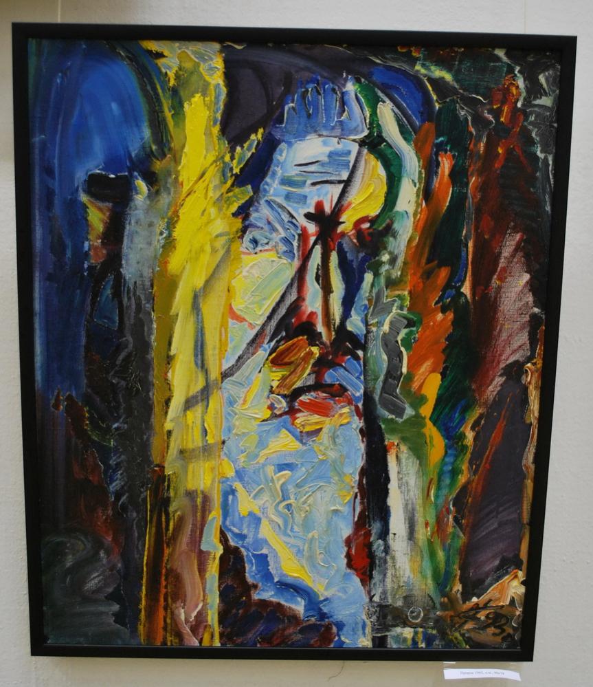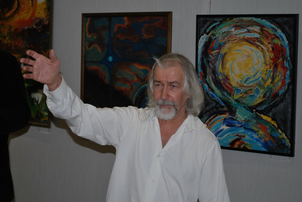 Мне очень понравилась выставка, картины очень энергетически сильные, чувствуется вложенная в них экспрессия.  Вечное противоборство света и тьмы, цвета и черной краски выливается на холстах в яркие образы. Художник очень интересно рассказывал о своих работах, каждая из которых является в своем роде притчей, где есть и светлые ангелы, и мятущиеся человеческие души, находящиеся в вечном движении и поиске ответов и смыслов. К сожалению я,как всегда, без фотоаппарата, поэтому спасибо Владимиру за фоторепортаж.   |