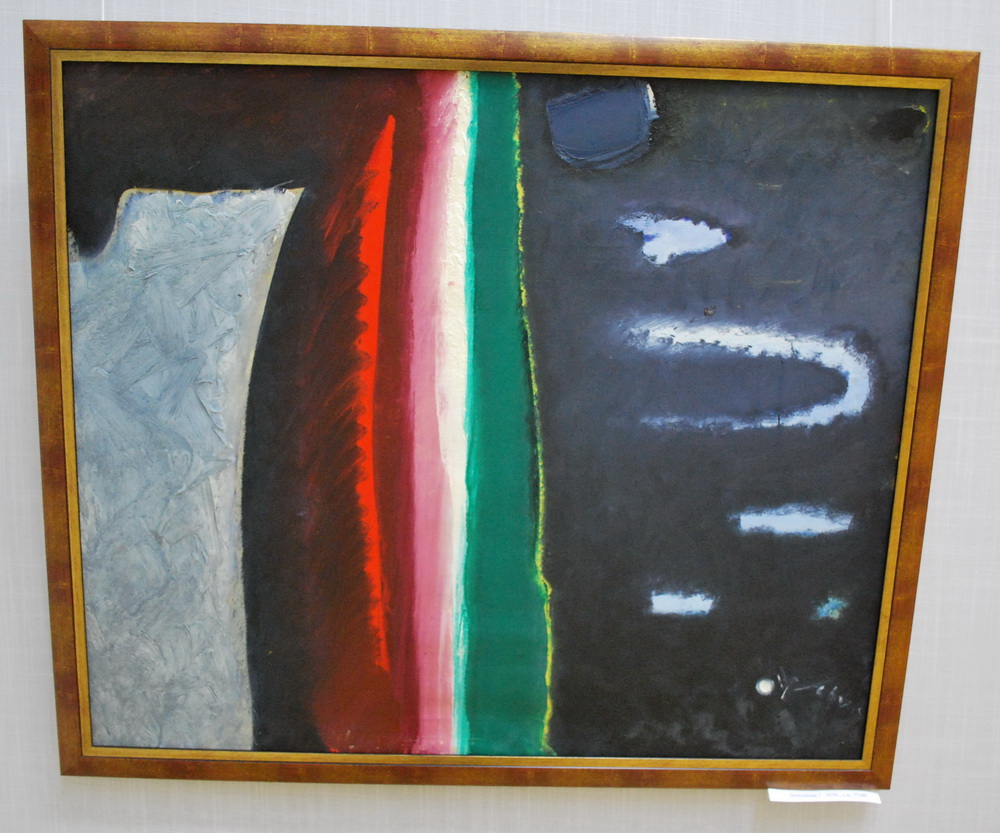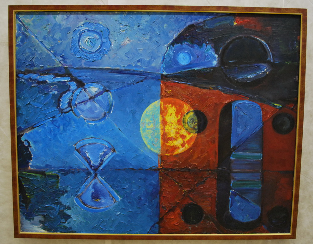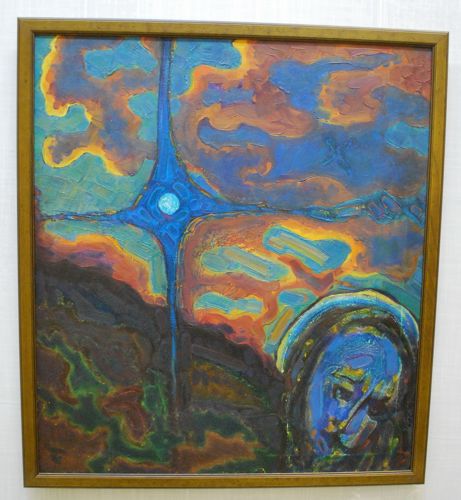 Сегодня был на выставке, не хочу сказать что все работы понравились, но есть очень сильные. Удивительное и странное сочетание беспредметного с вполне отчётливыми сюжетными линиями. Мне особенно понравилась картина на которой, как я понял, художник изобразил себя на фоне заката. |