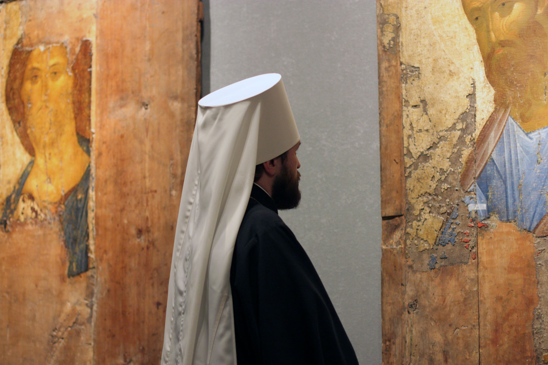 На первой фотографии сообщения №4 иконы рассматривает митрополит Волоколамский Иларион, председатель Отдела внешних церковных связей Московского Патриархата.