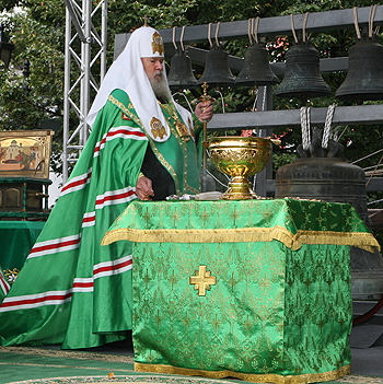12 September (2008), the day of the finding of the relics of St. Prince Daniel of Moscow (1652), at the St. Daniel Monastery Patriarch of Moscow and All Russia Alexy II and Russian President Dmitry Medvedev has headed the church and community celebrations devoted to the act of transfer St. Daniel Monastery historical ensemble of the Danilov bells are returned to Moscow from Harvard University, USA Morning at the Trinity Cathedral of St. Daniel Monastery, the celebratory liturgy, which made Metropolitan of Kaluga and Borovsky Clement, managing director of the Moscow Patriarchate, Archbishop Arseny of Istra, Bishop Alexander of Dmitrov. During the Divine Liturgy, Metropolitan prayed Volgograd and Kamyshin Herman. After the service the procession with the relics of the honest of the Holy Prince Daniel of Moscow was held from Holy Trinity Cathedral in the Monastery Square where you installed the bells returned.