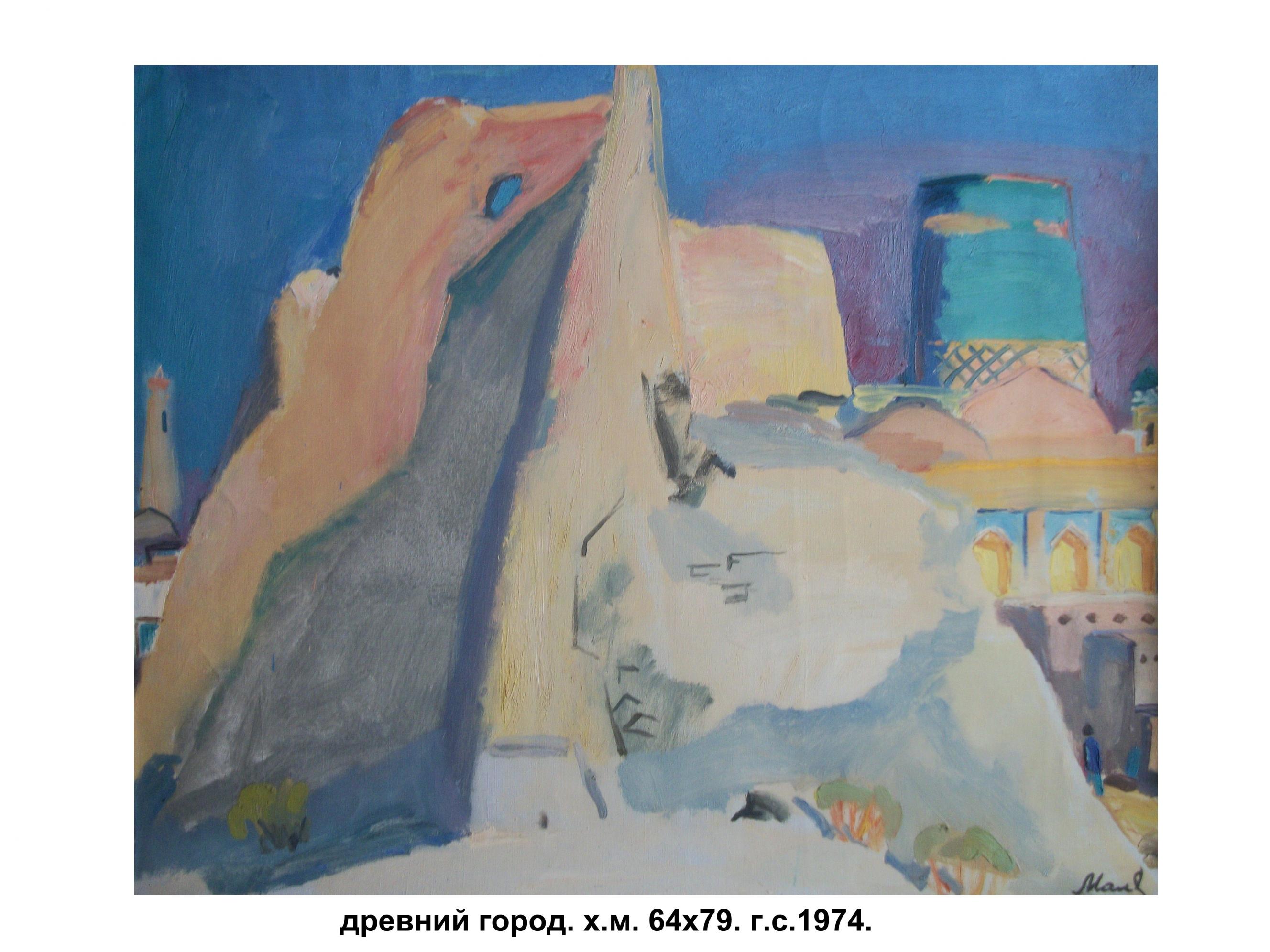 Honored Artist UzSSR.Avtor emblem of Samarkand, the painter, schedule, a professor, a talented artist from Uzbekistana.Raboty are, at the Museum of Arts of Uzbekistan (Tashkent) Art Museum (Samarkand), Art Museum (Nukus), in private collections. 1.58h43 sm.bum.akvarel "street of Samarkand" 1961. 2.51h73 see bum.akvarel 1961 3.60h43 cm, paper, watercolor, "Bibi-Khanum," 1961. |