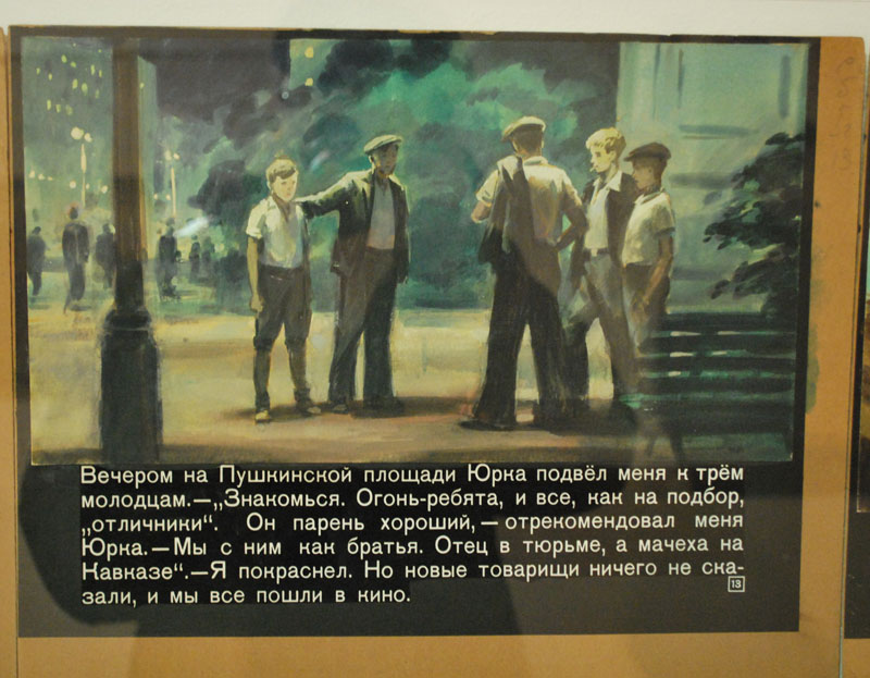 Каркас экспозиции держат рисованные кадры для диафильма по гайдаровской «Судьбе барабанщика». Там хэппи-энд: шпиона поймали, бандита убили, пионера вылечили. В экспозиции есть маленькие фотоаппараты для сексотов – прикольные. Через тридцать лет примерно такими же щелкающими сумочками дамы из КГБ фотографировали квартирные выставки нонконформистов. |