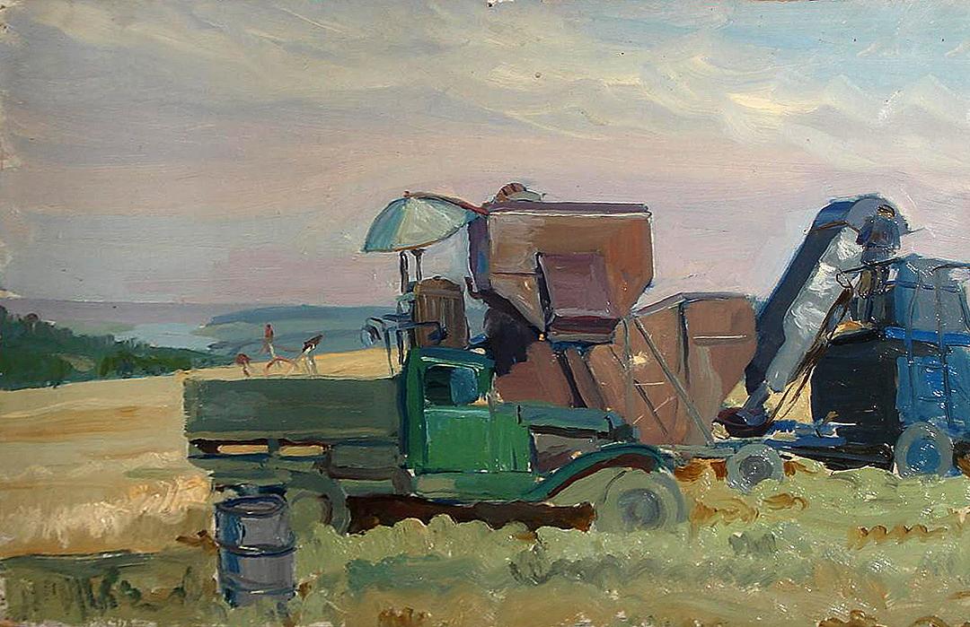 Попов Борис Никанорович. (1909-2001) Московский живописец. Учился в школе-коммуне им. П.Н. Лапшинского у Я.А. Башилова (1919). Закончил художественное училище памяти 1905 года, где обучался у Е.Н. Якуба и С.Н. Николаева. В 1929 г. принял участие в Международной выставке студенческих работ в Лондоне. Заслуженный работник культуры РСФСР (1975). В 1930-1933 гг. работал художником-постановщиком в театрах Владивостока, Ачинска и других городов Сибири. "Сбор зерна" 40Х60 картон масло 1946 год |