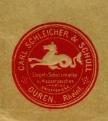 У Вас - образцы печатной продукции немецкой фирмы Карл Шляйхер и Шюлль (Carl Schleicher & Schüll). Ее конгревная печать с эмблемой в виде морского конька приведена на Вашей иллюстрации 4. Фирма основана в 1856 г. и существует до сих пор. Славилась применением передовых технологий в печатном деле, а также высочайшим качеством печати. Благодаря этому, спектр печатной продукции очень широк - от визитных карточек и репродукций до акций, ценных бумаг и даже денежных банкнот. Про эту фирму можно прочесть на