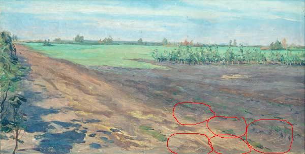 На первом фрагменте (фотo 1) не «горный сайгак», а лошадь. Поясничный отдел никуда «не прыгал». Он находится на своём месте. Но я понимаю, почему вам показалось, что задняя часть лошади как бы задрана вверх. Этому есть простое объяснение. Там, где должно было быть продолжение спины животного, художник мазком обозначил элемент упряжи. Точно такие же элементы художник изобразил и на остальных лошадях (фотo 2). Этот элемент упряжи попадает в тон с фоном, поэтому кажется, что спина лошади уходит резко вниз к краю картинки. Элементы упряжи, изображённые на других лошадях, тоже попадают в тон с окружающими их некоторыми цветовыми пятнами. На фотографиях, которые я прилагаю к этому сообщению, я выделил те детали, о которых говорю. На втором фрагменте изображена лошадь, передние копыта которой стоят ниже задних. Это получилось потому, что лошадь, с которой художник писал этюд, стоит передними ногами либо в ложбинке, либо в ямке, которые естественно могут быть на возделываемом поле. Она совершенно твёрдо стоит на ногах, никуда не заваливается. Это обычная ситуация для таких животных, как лошадь, имеющих длинное туловище. Вы пишете, что Стожаров никогда не процарапывал передний план обратной стороной кисти ( как это сделано на рассматриваемом нами этюде). Это неверно. Как я уже писал, мне доводилось видеть (в мастерской на Фрунзенской набережной) большое количество ранних (50-х гг.) этюдов художника (некоторые из них были куплены мною у Александра). И этот приём Стожаров использовал именно в этюдах того времени. Да, вы и сами можете убедиться в правоте моих слов, посмотрев на те фотографии (фотo 3;4;5;6), которыми я сопроводил свой текст. Эти «царапины» как раз и являются одним из доказательств авторства Стожарова. |