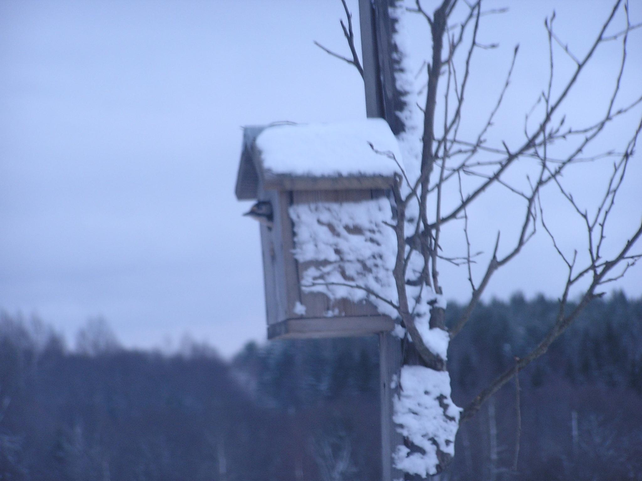 Я у себя нагородил целый огород перед окном.В кормушку прилетало 8 видов птиц:сороки,сойки,свиристели,воробьи,лазоревка,про стая синица,синица с белыми бочками,один раз были снегири и один раз щеглы.А в скворечнике ночевал дятел.Фото такое мутное,потому что я через стекло снимал.
