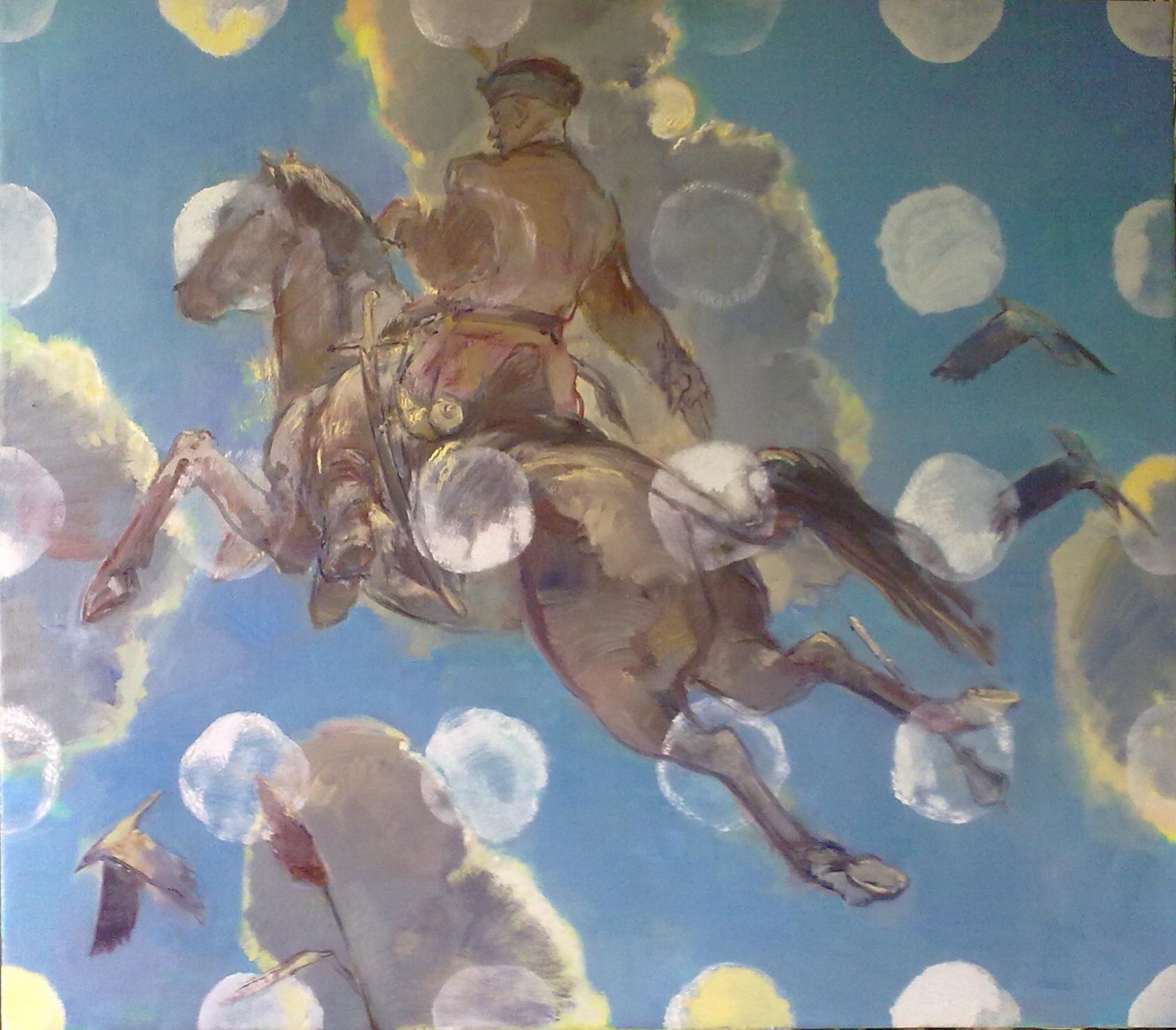 Вчера зашла в мастерскую к художнику Владимиру Кабаченко http://forum.artinvestment.ru/showthread.php?t=56701 и увидела вот такую картину. Изображен дух козака, устремляющийся в небо. И шарики...
