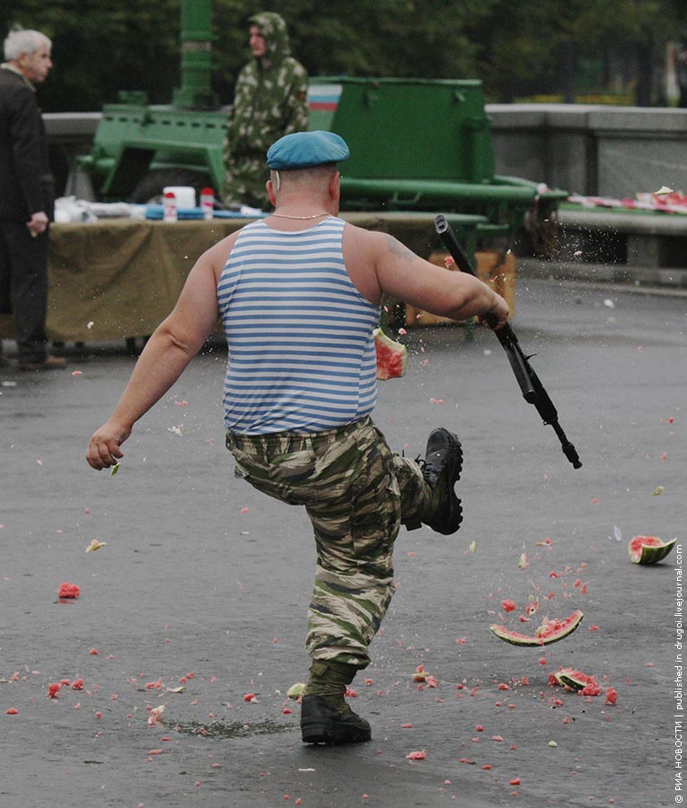 Вот парк Горького сегодня одели в тельняшки и береты. Закупили 20 тонн арбузов и раздали десантникам. Повесили плакаты. Написали "Никто кроме нас". Цитата: