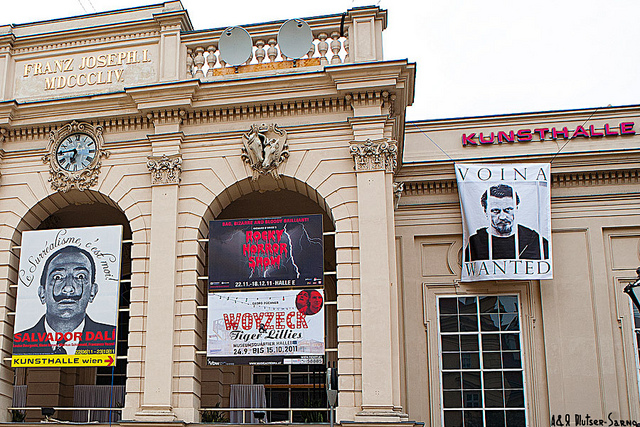 Группа Война, объявленная российскими копами в международный розыск, начала всемирную акцию протеста против незаконных репрессий российских художников. Война развесит по всему миру тысячи транспарантов «Война – Розыск» (Voina - Wanted) с портретом идеолога группы Война Олега Воротникова за решеткой в зале суда размером 3 х 4 метра. Как известно, по требованию МВД РФ Интерпол ищет находящегося безвыездно в России Олега Воротникова по всему миру. При этом сотрудники российских правоохранительных органов еще на обыске в Москве 15 ноября 2011 года незаконно конфисковали у группы Война все документы, так что Олег Воротников, Наталья Сокол, Каспер Ненаглядный Сокол и Леонид Николаев никак не могу выехать за рубеж, хотя их приглашают западные кураторы современного искусства, о чем уже писали многие СМИ мира. Таким образом, объявление в международный розыск знаменитых художников, безвыездно находящихся в России, является не только издевательством над современным искусством, но и над Интерполом. Эта акция является пародией на действия МВД РФ и Интерпола, который также нуждается в реформировании, поскольку давно уже стал беспомощной игрушкой в руках коррумпированных чиновников из авторитарных стран. Photo - Yana Sarna, Voina Group activist. Initiator of the action - Alexei Plutser-Sarno, Voina Group media-artist. The protest art action started with the support of Sydney Ogidan (independent curator and director of the Black River Festival), Gerald Matt (director of Kunsthalle Wien), Catherine Hug (curator of Kunsthalle Wien). Отсюда. Последний раз редактировалось Кирилл Сызранский; 23.09.2011 в 20:42. |