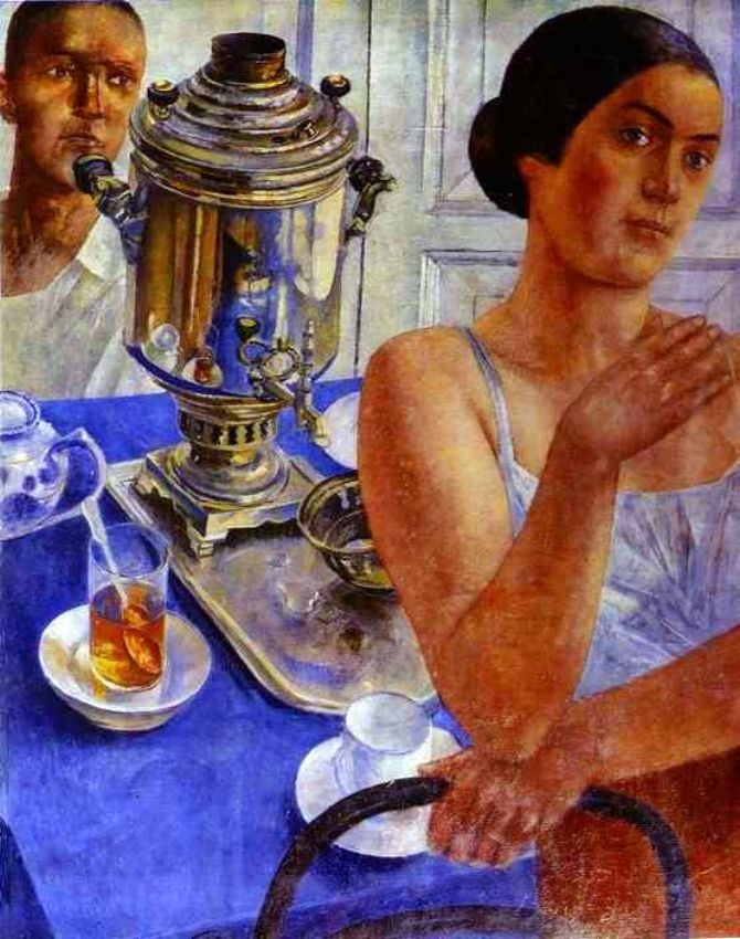 Не исключено, Вы все это знаете и без меня. Для меня же в этих сведениях много нового, может, кому-то тоже будет интересно. Допросила двух пожилых русских женщин, которые по возрасту, (в 30-е) могли бы пить чай вместе с КПР, одной 90 лет, другой 105. Вот что они рассказали: Когда семья собиралась за чайным столом, ставился большой семейный самовар, обязательно льняная скатерть, как бы трудно не жилось после уплотнения, это правило соблюдалось. Мужчина всегда чай пил из стакана. Женщины и дети - из чашек. Наливали крутой кипяток, чтобы стекло не треснуло, в стакан ставили чайную серебряную ложку и кипяток лили на нее, так никогда не треснет. Пили без подстаканника, держа пальцами за край стекла. "Горячо? Да, на то он и мужчина, чтобы преодолевать неудобства." Стакан ставили на блюдце, чтобы не пролилось. Вообще, ели и пили медленно, проливать чай на скатерь или ронять еду было непозволительно, дурной тон, детей учили аккуратности за столом с малолетства. Одна скатерть служила некоторое время, после чаепития ее сдвигали со стола и держали неподалеку, до следующего чая. Только сразу после стирки и глажки были заметны складки крест-накрест. После второго-третьего использования возникала некоторая помятость, если надо - можно рукой разгладить. Когда мужчина за работой просил чаю, приносили небольшой самовар и стакан, в этом случае скатерть, как правило, не стелили. Эти сведения соответствуют чайным натюрмортам КПВ, включая и тот, что под вопросом: продольные морщины скатерти (сдвигали). Семейное чаепитие - наличие скатерти, большого самовара, чашек и стакана. Маленький самовар, стакан и отсутствие скатерти - чай на одного.. |