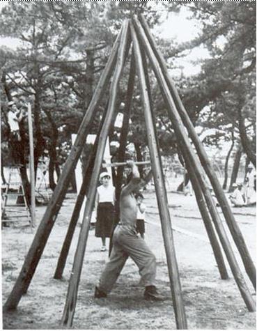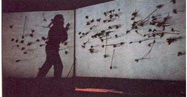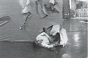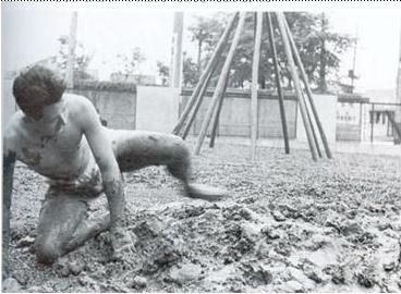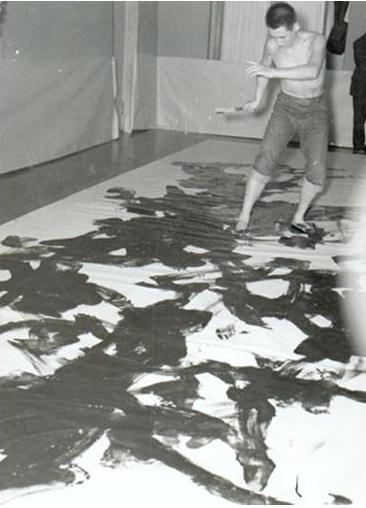 Sirad Kazuo: tied up with rope, rushes into the void and splashing paint; simulates the struggle in the mud, arrows pierces a large canvas with paint, paints his nails and feet