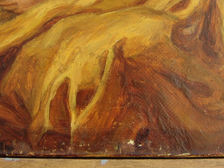 Здравствуйте! Прошу помочь. Нет никакой информации по этой работе, только, что европейская. Какие есть предположения? По автору?Возраст? И какова может быть приблизительная стоимость? Размер небольшой 25.5 х 35 см, масло. Также не понимаю надпись на обратной стороне.