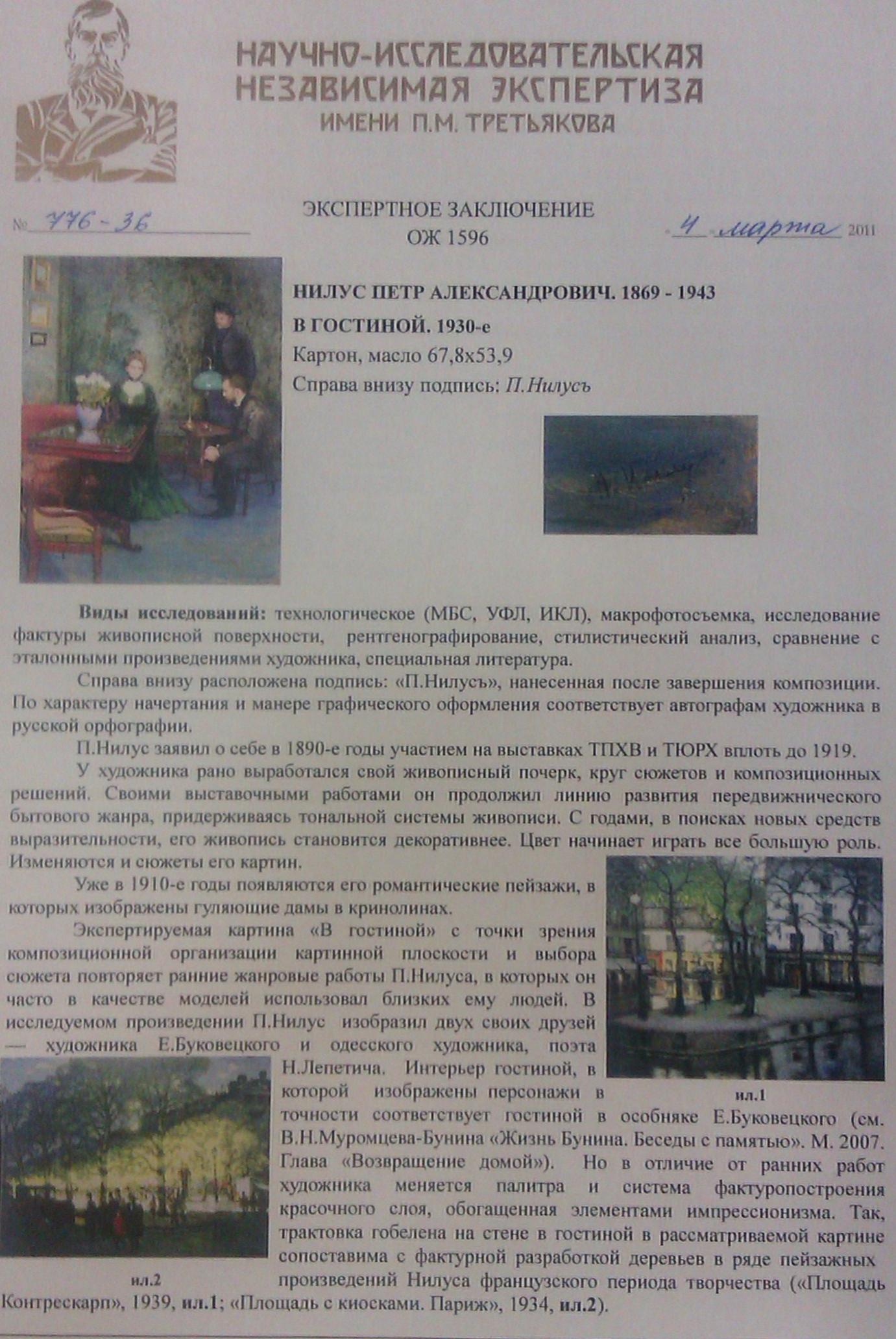 В одной одесской коллекции уже много лет хранится работа П. Нилуса (без подписи). Работа нигде никогда не репродуцировалась и не экспонировалась. До середины 1980 - х годов картина находилась в семейном собрании одной из дочерей К.К.Костанди. В конце 2000 - х годов у человека, вхожего в семью, оказалась фотография этой картины. Спустя некоторе время, в Одессе, я увидела копию с оригинала, написанную по фотографии, также без подписи, только гораздо большего размера. Оригинал - 48 см. по большей стороне. Сфотографировать эту копию мне не удалось. После этого, я открыла на форуме тему, в которой показала подлинную картину, и в которой участники могли обсудить, кто на ней изображен. Я показывала фотографии трех близких друзей - Нилуса, Лепетича и Буковецкого. Пришли к выводу, что на картине Лепетич стоит, Буковецкий сидит, писал Нилус. Все участники того обсуждения прекрасно помнят тему и до сих пор находятся на форуме. После открытия темы, мне в личные сообщения написал один из участников, что он видел эту картину на аукционе Корнерс в Киеве, что ее хотели дать на торги, но по ней было несколько спорных вопросов и она не прошла. На что я ему ответила, что это не картина из моей темы, а подделка. Если этот, уважаемый здесь многими человек, захочет подтвердить этот факт, я буду рада. Может быть, кто-нибудь от Корнерса делал фотографию работы, которая "не прошла" и сможет показать ее здесь. Также я рассказала эту историю еще нескольким пользователям три года назад. После этого я попросила удалить тему, так как в ней было много личной информации, которой, к сожалению, уже успели воспользоваться. И вот, недавно, опять всплывает копия с этой картины Нилуса, только уже с подписью в правом нижнем углу и уже не в Одессе, как четыре года назад, а в России. Причем с довольно интересным экспертным заключением, в котором работа датируется 1930-ми годами и имеет свое новое название "В гостинной". Фотографии экспертизы вы видите ниже и можете ознакомиться с ней детально. Выделю для вас, друзья, лишь несколько фрагментов.