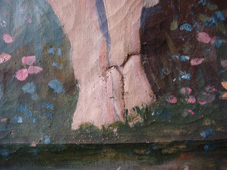 Please tell about the picture, is it worth it to restore or not. There are two ways: 1) To restore. How much will it cost? 2) Do not renovate and sell as is. And also a question of price. Defects in all the photographs. I can tell when the picture hangs on the wall, the only visible defect in the girl's neck. Upon closer examination: 1) shows tears of the canvas; 2) It can be seen bulging canvas. Size of painting 103x65 cm Box width 7 cm framed painting. Unknown artist G. Ovechkin. 1947. |