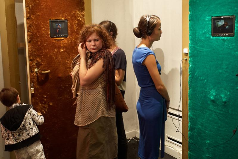 На форуме Artinvestment была соответствующая тема. http://forum.artinvestment.ru/showthread.php?t=147581 Теперь эта очень необычная «видеосимфоническая инсталляция» доехала до Москвы. Итак, 12 дверей с мониторами для подглядывания за лестничной клеткой, аналогом устаревшего глазка, транслируют унылый, ничем не примечательный подъездный быт. Ничего не происходит до того момента, пока зритель не подойдет поближе к двери. Обитые искусственным мехом, поверхности квартирных затворок начинают оживать. Нажав, на кнопку звонка, зритель «вызывает» один из архетипов нашего российского (читай постсоветского) сознания. Ведь по ту сторону двери его ждет незваный гость — один из непримиримых врагов тихого домашнего досуга.