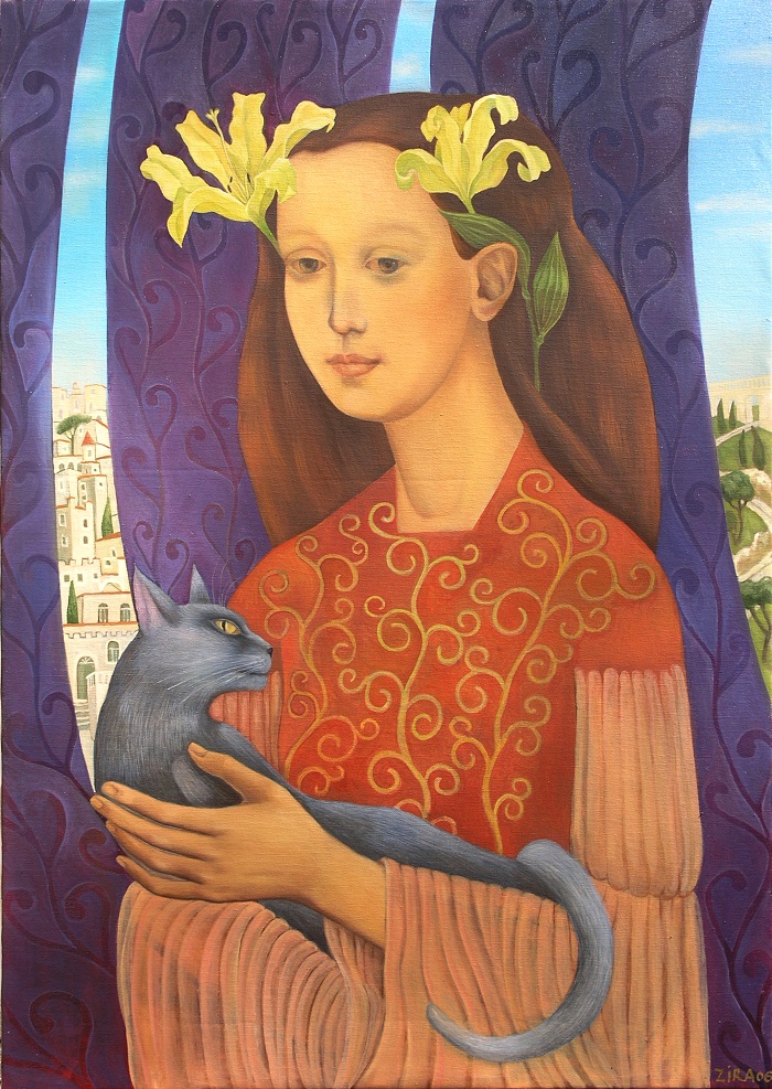 ![]() Магический театр Ирины Зайцевой «Люблю появление ткани…» Осип Мандельштам «…стоял чудной красоты волшебный театр» Алексей Толстой Искусство Ирины Зайцевой располагается в уникальной зоне – между сном и бодрствованием, именно в той точке, когда разум еще не вступил в свои права, а душа продолжает свой путь в идеальном мире реализованных желаний. Эта художественная реальность пронизана идеями согласия и любви, в ней торжествует универсальный язык понятный людям, животным, растениям, стихиям и звездам. Фактически перед нами предстает «Золотой век», его внутренние измерения, наполненные ангелами и цветами, присутствующие во всех фундаментальных культурах, как детство нашей цивилизации, хранящее в себе естественные взаимоотношения и непосредственность чувства. Его световые состояния живут в вибрации приливов и отливов – от светлого к оранжевому, огненно-красному и вновь возвращаясь в ультрамариновое, наполняясь голубым, небесным в своих высших иерархиях. Персонажи Ирины Зайцевой близки героям раннего итальянского Возрождения, вернее это всегда одна и та же героиня, живущая в своих вариативных ипостасях, - как в мечтах, везде проявляясь своим светлым ликом, излучая энергию сочувствия всему живому, с кем она вступает в контакт. Ее тело пластически неизменно связано с окружением, оно неотделимо от мира природы, от состояния пробуждения как нового рождения, от голубого неба и цветущих деревьев. Ее образ соединяется с Кэролловской Алисой, способной творить чудеса и естественно появляться в мире Зазеркалья. Вероятно в нем присутствует прообраз самой художницы, ее открытость высокой поэзии, ее право на особые диалоги с животными и ее удивительное свойство терять гравитацию, обладать безвесием, воспаряя над планетой Земля. Иногда героиня Ирины Зайцевой возвращается в наш странный мир, переживая ностальгию по утраченным человечеством идеалам, подлинным ценностям, погружаясь в щемящую реальность, фиксируя таинственное прикосновение к ней – словно бабочка задела тебя своим прозрачным крылом и оставила след на щеке, магический орнамент, волшебную пыльцу, явное доказательство существования иного, «настоящего» мира. Этот мир не имеет складок и теней, он предстает во всей своей необычайной яви – «цветами августа», «зеленеющим апрелем в саду» или «последним листом осени». Сотворенный художницей, он не подвержен разрушению даже в своих предельных точках. Его живая ткань неизбывна, ее животворность мерцает в своей скромной и одновременно органической красоте. Композиции Ирины Зайцевой не знают перспективных сокращений, они даются нам в своей первозданности, словно опрокидываясь на нас, как пространство любого иконологического, сакрального произведения. Художница обращается в абсолютном бескорыстии к своим сюжетам как ребенок, воспринимающий мир в своей изначальной целостности. Именно это великое детское чувство позволяет Ирине сохранять культурную память, в которой таится будущее. Перед нами искусство, несущее в себе целебные свойства, оно способно наложить повязку на рану, ее образы живут по законам праздничной культуры, останавливая время и сберегая все возможные смыслы рождающейся реальности, превращая любой предмет в одухотворенный организм, в живое существо. Пушкинский «кот ученый» естественно начинает жи