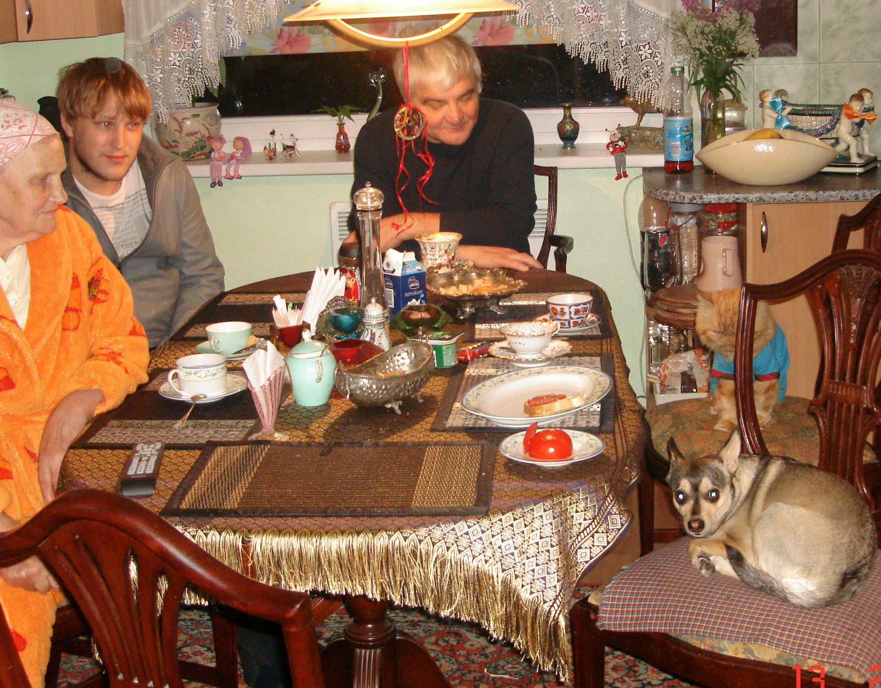 Когда мы едем на работу, то завозим животных к бабуле, иногда они остаются у неё "в продлёнке" Сегодня ночью наш сын улетал домой, в Таиланд. Посидели за столом. У животных есть своё место за столом. в любое время, если мы за стол, то малые автоматически занимают место. Нет не едят за столом, это присутствие! На фотке три часа ночи. Перед отъездом в аэропорт. |