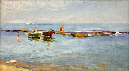 Тема «Свидание» была очень популярна в 1950-60-е годы в творчестве многих советских художников (можно даже создать отдельную тему). Попробовал себя в ней и мой герой. По-моему, прослеживаются ностальгические нотки в сюжете. Ведь художник проходил воинскую службу в Крыму и там встретил свою будущую жену. Этюд «Телега» написан эмоционально, искренне, на одном дыхании. Перед нами раскаленное летнее солнце и тишина, которую прерывают деревенские звуки: то прокричит петух, то лошадь всхрапнет на выгоне, то залает собака. Этюд «Весна на Днепре» дышит весенней свежестью и ароматом. |