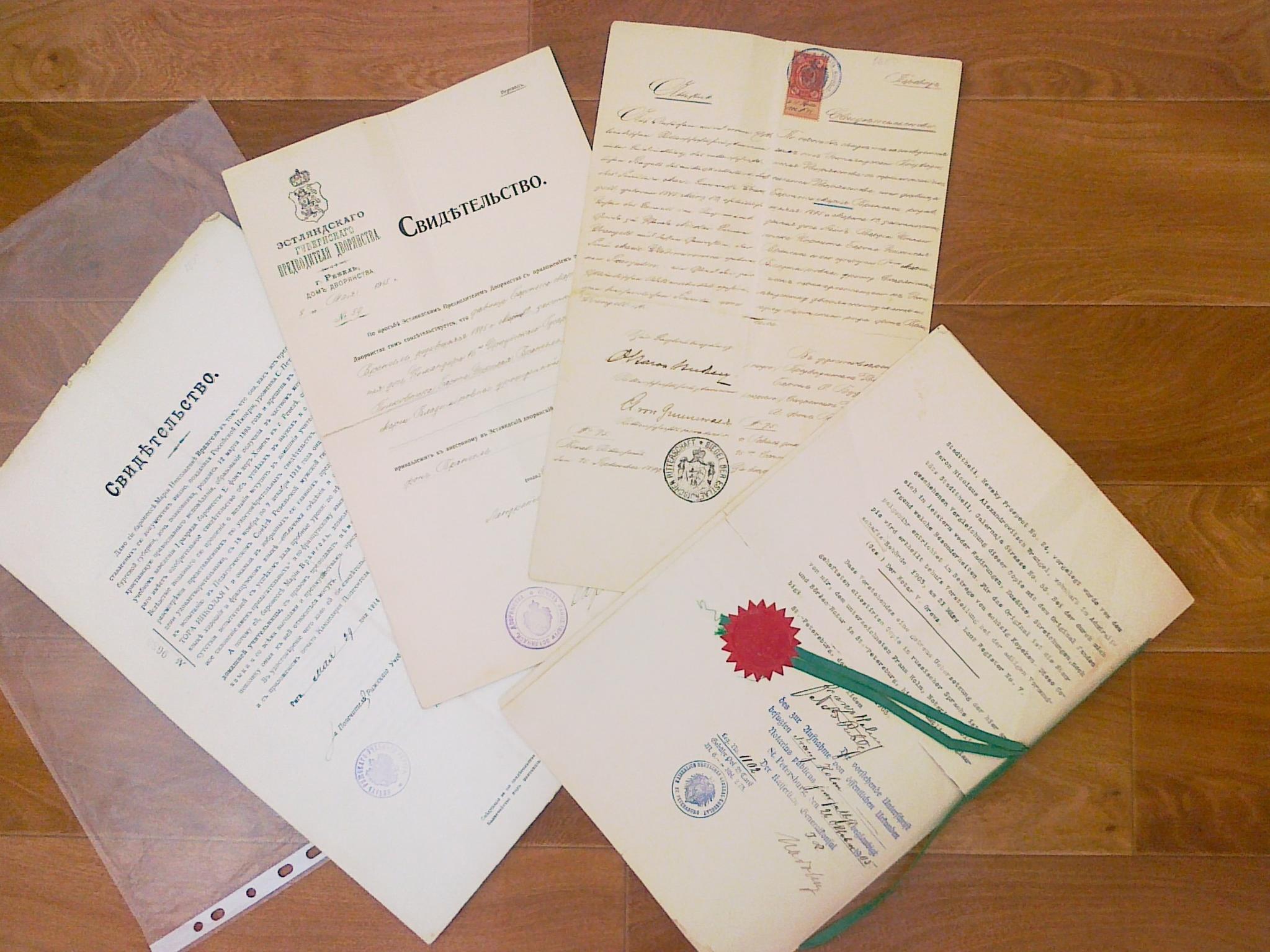 дочери барона Врангеля Николая Александровича, русского генерала, управляющего делами и адъютанта Великого князя Михаила Александровича, командира 16-го гусарского Иркутского полка. Документы: 1. Свидетельство о рождении (оригинал и копия 4 листа) размер листа: 39,5 х 25,5 см 2. Свидетельство о дворянском звании, выданное Эстляндским предводителем губернского дворянства (оригинал 2 листа) за 1899г.размер листа: 35,5 х 22 см. 3. Свидетельство из того же дворянского дома, о том что девица, баронесса Врангель М.Н. принадлежит к внесенному в Эстляндский дврорянский матрикул к роду баронов фон Врангель (оригинал 2 листа) за 1913 г. размер листа: 35,5 х 22 см. 4.Свидетельство об бразовании (оригинал 2 листа) за 1914 г. размер листа: 40 х 25,5 см. Некоторые листы имеют надрывы в районе переломов бумаги. По поводу цены, пишите в личные сообщения или на почту.