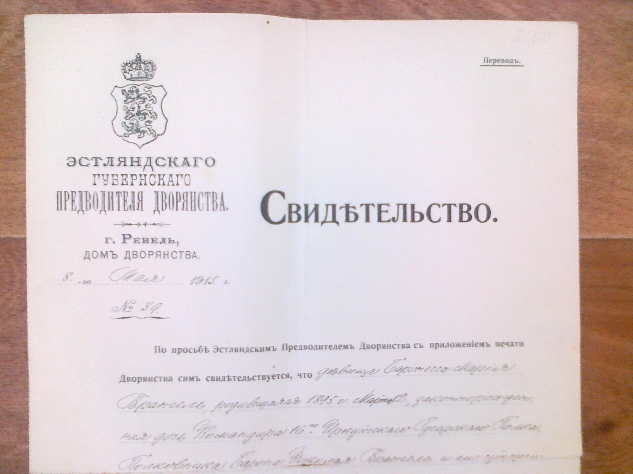 дочери барона Врангеля Николая Александровича, русского генерала, управляющего делами и адъютанта Великого князя Михаила Александровича, командира 16-го гусарского Иркутского полка. Документы: 1. Свидетельство о рождении (оригинал и копия 4 листа) размер листа: 39,5 х 25,5 см 2. Свидетельство о дворянском звании, выданное Эстляндским предводителем губернского дворянства (оригинал 2 листа) за 1899г.размер листа: 35,5 х 22 см. 3. Свидетельство из того же дворянского дома, о том что девица, баронесса Врангель М.Н. принадлежит к внесенному в Эстляндский дврорянский матрикул к роду баронов фон Врангель (оригинал 2 листа) за 1913 г. размер листа: 35,5 х 22 см. 4.Свидетельство об бразовании (оригинал 2 листа) за 1914 г. размер листа: 40 х 25,5 см. Некоторые листы имеют надрывы в районе переломов бумаги. По поводу цены, пишите в личные сообщения или на почту.
