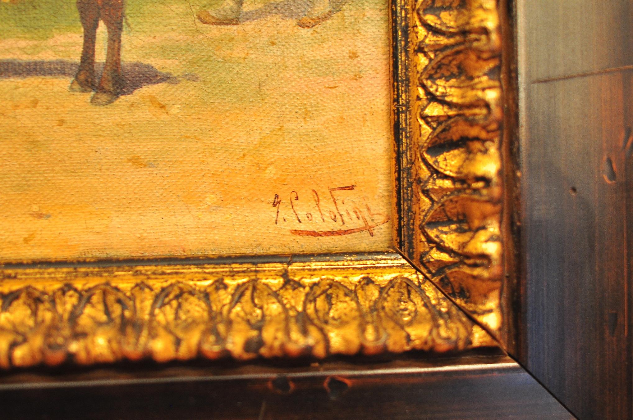 At first I thought that it is copying from some magazine, but this is unlikely , the author does not put the horse's head behind the figure . It is possible that the author was working on a photo , such as composing and re-drawing ( rather naive painting, in general). In general, for some reason, gives Central Asia, although everything seems to be dressed like in Russian, horse also typically Russian , stunted , and where even wore sandals ... Perhaps the late 19th - early 20th century. Maybe some foreigner to make do painting. |