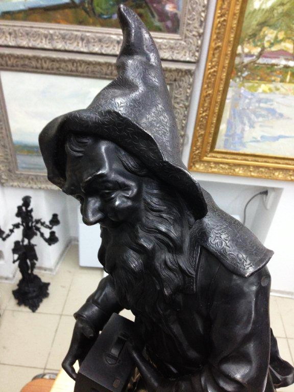 Год создания модели: конец 1880-х гг. Материал: Чугун Н. Мейер – французский скульптор, мастер жанровой и аллегорической пластики. В конце 1880-х создал серию интерьерных скульптур «Гномы». В начале ХХ века Каслинский завод отливал пять скульптур этой серии. Гномы – персонажи западно-европейской мифологии; карлики, охраняющие подземные сокровища. Гномы Н. Мейера – симпатичные и простодушные человечки с традиционной атрибутикой: окладистыми бородами и остроконечными колпачками на головах. Гном – фотограф улыбается и, слегка наклонясь вправо и вперед, держит у правого бедра коробку старинного фотоаппарата и т. д. Данных Гномов предлагают от 30 до 50 т. Руб. Учитывая год Ваших ближе к последней цифре. А там, как договоритесь....