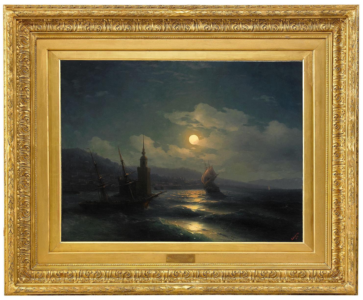 На предаукционном показе "Русских Сезонов" выставлена работа Айвазовского "Лунная ночь". Эта картина мариниста уже продавалась на данном аукционе в 2011 г.г. Похоже, что цена на это полотно изрядно завышена. В 2007 году на Сотбис этот пейзаж продавался с эстимейтом 44 000 - 54 000 евро. Столь скромная цена объяснялась тем, что, как отмечалось в каталоге, была проведена обширная реставрация. (Согласно общеприпринятому мнению, если на работе художника при реставрации было записано 30% оригинального слоя, авторство ставится под вопрос. Реставрация не вызывает сомнения в авторстве только в том случае, если утраты произошли на неответственных участках - по краям, на фоне, не затрагивая основную композицию.)