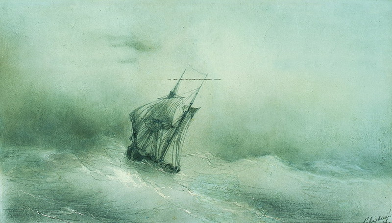 Даже при таком качестве фотографии могу сказать, что работа эта не принадлежит кисти Айвазовского. Во-первых, автограф не внушает доверия. Во-вторых, в работе налицо ляпы. Так например, судно с убранными парусами, отданное на волю волн, ветром гонит на зрителя, первая волна опрокидывается на зрителя в левом углу картины, тогда как веревки такелажа и флаг на мачте рвутся в другую сторону, т.е. от зрителя вглубь картины. У Айвазовского таких промахов не было. Обсуждать наличие кракелюра и кружевной сетки на волнах не позволяет качество снимка.