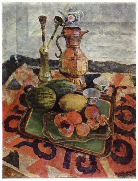 Perhaps who may be of the sisters Aslamazian , Yeranuhi or Miriam. Pay attention to a certain feature , the main subjects of still life , pomegranate and quince written more broadly than the carpet, which serves as a backdrop . It is often the opposite. Take a look and analyze their work, can find some similarities.