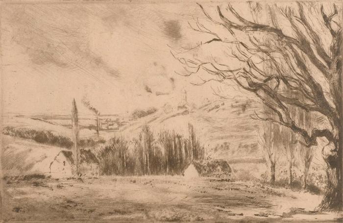 PISARRO, CAMILLE (Charlotte Amalie 1831 - 1903 Paris). Vue de Pontoise, 1885. Radierung mit Aquatinta. 15,7 x 24,5 cm (Blattgrösse 40 x 34 cm). Unterhalb der Darstellung rechts mit dem Künstlerstempel versehen. Mit Bleistift nummeriert: 4/50. Delteil VII/VII. Gerahmt. - Besonders schöner, kräftiger Druck in vorzüglicher Erhaltung.