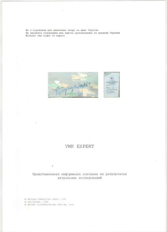 1. Автор: Николай Глущенко 2. Материал и техника изготовления: масло,среднезернистый холст,покрыт белым авторским грунтом (средне-мелкосетчатый кракелюр грунтового происхождения) 3. Размер (вертикаль х горизонталь для живописи):96х79,5 см. 4. Время создания:1948г. 5. Подписи, надписи, штампы, бирочки: Пейзаж подписан. Справа внизу - авторская подпись и дата, выполненные голубой краской: Глущенко /48. Подпись имеет общий микрокракелюр с нижележащим красочным слоем, аутентична известным автографам художника. 6. Состояние (прорывы, осыпи, потертости): Удовлетворительное 7. Экспертное заключение: ВМК-Экперт регистрационное удостоверение NL-203. 8. Качественная фотография картины: фото 1-3 9. Происхождение картины: Частное собрание 10.Цена картины: 60 000 у.е (доллар США) __________________________________________________ _______________ Глущенко Н.П "Сумерки" 1. Автор: Николай Глущенко 2. Материал и техника изготовления: масло,среднезернистый холст,покрыт белым фабричным грунтом. 3. Размер (вертикаль х горизонталь для живописи):83,5х99,5 см. 4. Время создания:1951г. 5. Подписи, надписи, штампы, бирочки : Картина подписана. Справа внизу - авторская подпись и дата, выполненные сначала синей краской: Глущенко/51,позже автор сверху повторил подпись темно-зеленой краской (подписи не совпадают). Обе подписи имеют общий микрокракелюр с нижележащим красочным слоем, аутентичны известным автографам художника. На обороте холста, внизу справа - паспорт Киевского товарищества художников, вверху-выполненная карандашом надпись: Сумерки/Глущенко Н. 6. Состояние(прорывы, осыпи, потертости): Удовлетворительное. 7. Экспертное заключение: ВМК-Экперт, регистрационное удостоверение NL-202. 8. Качественная фотография картины: фото 4-6 9. Происхождение картины: Частное собрание 10.Цена картины: 60 000 у.е (доллар США) Глущенко, Николай Петрович (1901 - 1977) - украинский художник. Работал преимущественно в жанрах пейзажа, натюрморта, портрета. В 1919-1924 гг. учился в Берлинской высшей школе избразительного искусства в Шарлоттенбурге. С 1925 работал в Париже. С 1944 гора жил и работал в Киеве. Преподавал в Киевской художественной школе, профессор Киевскогшху дожественного института (1939). Лауреат Гос. Премии им. Т.Г.Шевченко (1972). Народный художник СРСР (1976). Представлен во многих крупнейших музейных и частных собраниях. |