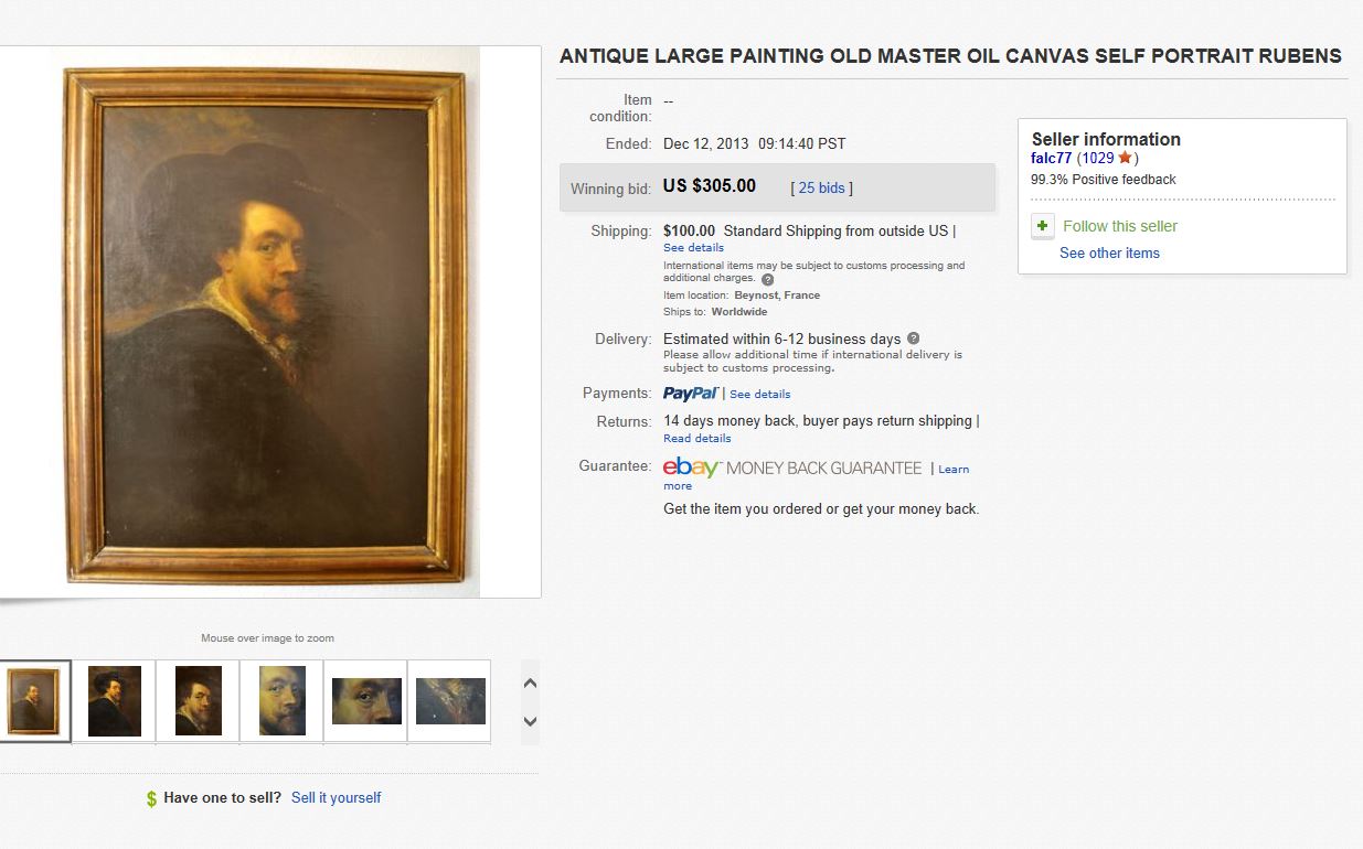 Вот, привожу описание с Ибея. PORTRAIT OF SIR Peter Paul RUBENS (1577-1640) Stunning Museum Quality large & well framed oil Painting on canvas. Antique English School Circa 1850. In an impressive antique high quality frame. Approx 200 YEARS OLD GUARANTEED. Comes from Old English stately Homes or even Castles. Total size (Frame include): 37 inches by 29.1 inches (94 cm x 74 cm) Image: 31.1 inches by 23.2 inches (79 cm x 59 cm) VERY GOOD CONDITION FOR ITS OLD AGE. Signed & label on back |